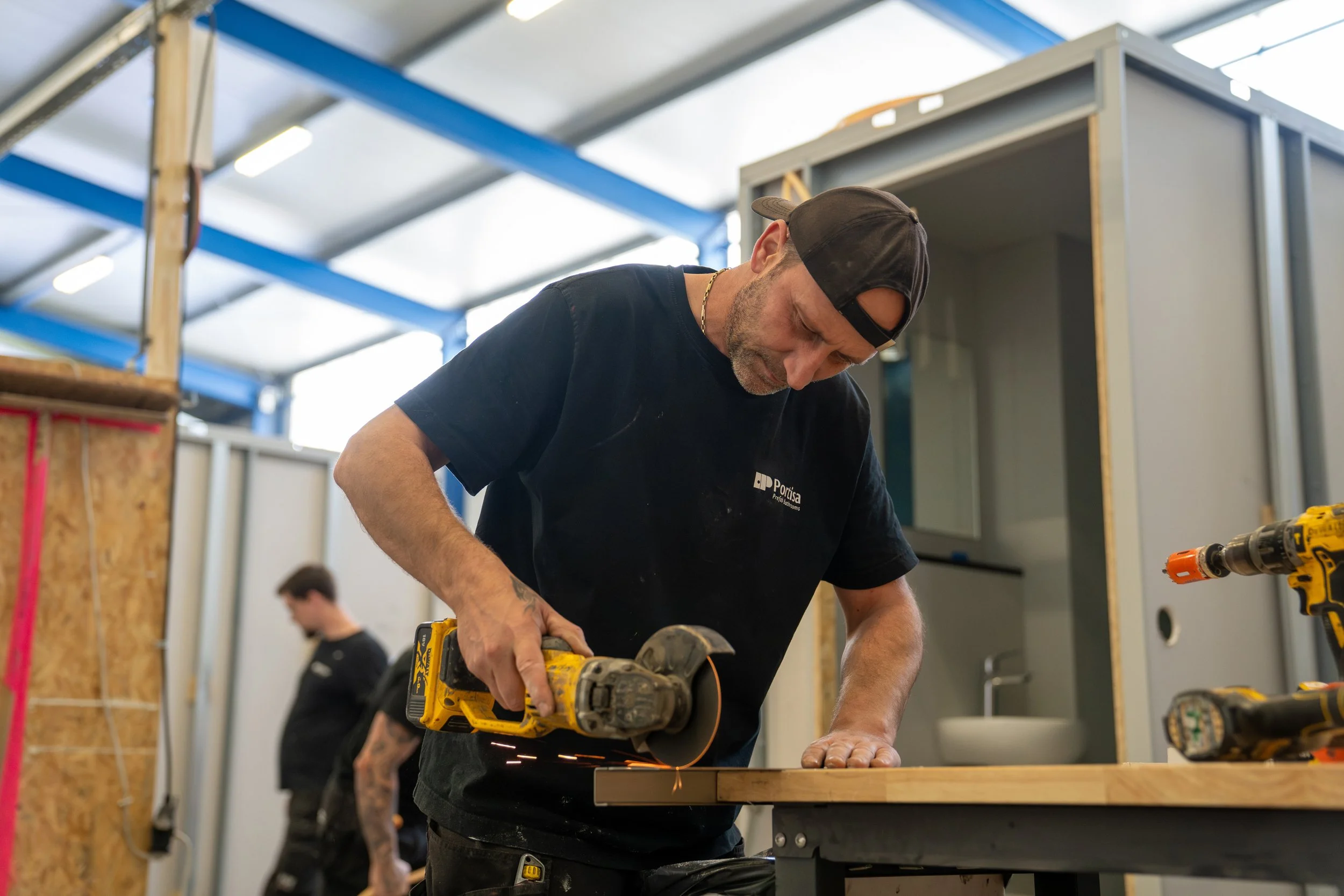 In onze fabriek bouwen we onder perfecte omstandigheden. Zo leveren we elke badkamer met dezelfde hoge afwerking en is hij op locatie direct gebruiksklaar.